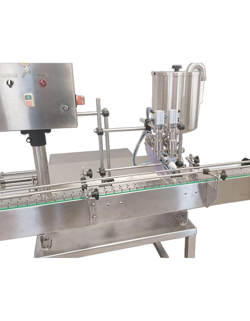 Αυτόματο ογκομετρικό μηχάνημα με 1 κεφαλή γεμίσματος. Φέρει ταινία ροής για την συσκευασία προς γέμισμα. Από πάνω τα μπεκ που γεμίζουν τις συσκευασίες ακολουθούμενα από τα φωτοκύτταρα αισθητήρια για την ενεργοποίησή τους. Στο μηχάνημα πάνω υπάρχει και ο πίνακας ελέγχου του με τα κουμπιά εναλλαγής λειτουργίας χρήσης από αυτόματο σε χειροκίνητο. Δεξιά από τον πίνακα ελέγχου έχουμε το δοχείο παροχής ρευστών προϊόντων που περνά μετά στις αντλίες και από εκεί στα μπεκ για να καταλήξει στο δοχείο - συσκευασία. Το μηχάνημα είναι εξολοκλήρου ανοξείδωτο και πληρεί όλες τις προδιαγραφές υγειονομίας.