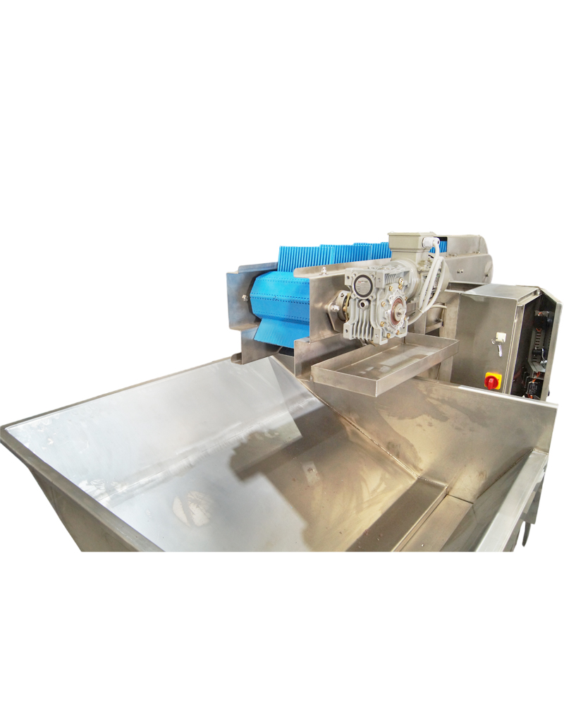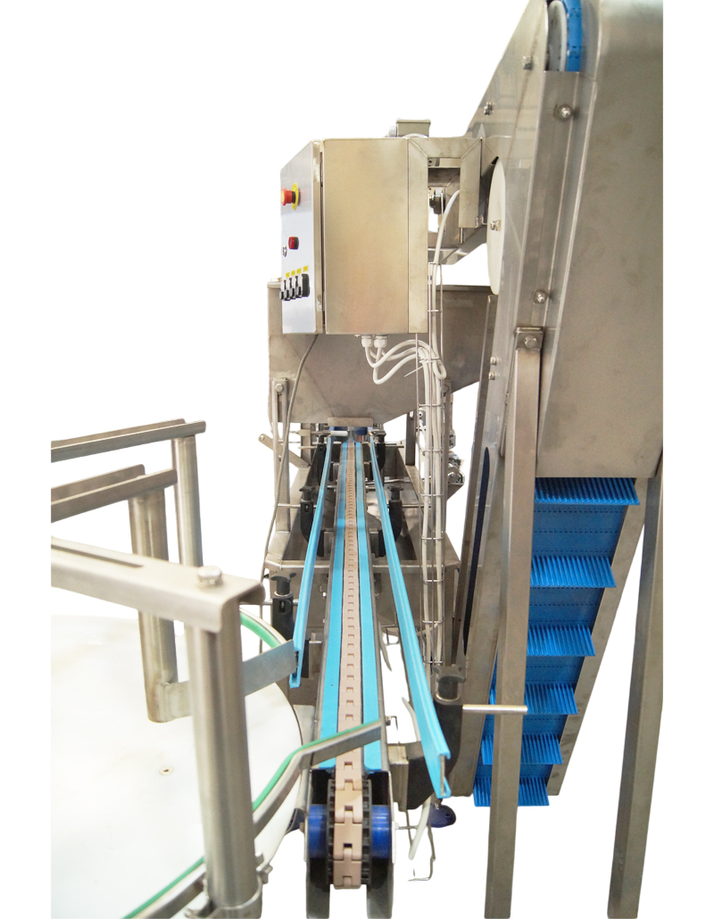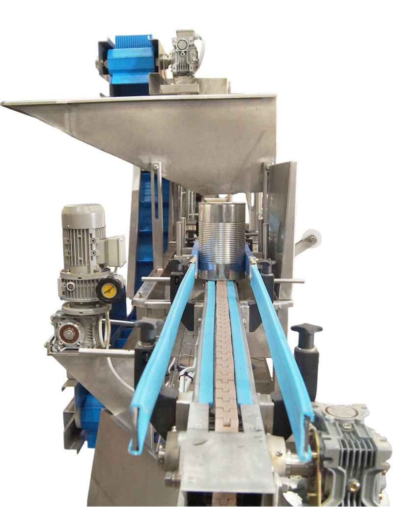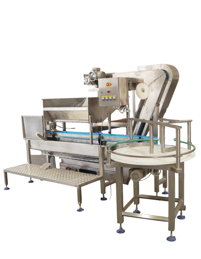 Ημι-Αυτόματη Γραμμή Ελιάς με τραπέζι περισυλλογής προϊόντων. Το μηχάνημα διαθέτει κοχλία άντλησης για την μεταφορά της ελιάς και την ρίψη μέσα στο δοχείο προϊόντων. Από εκεί μπαίνει στη συσκευασία και μεταφέρεται στο τραπέζι περισυλλογής συσκευασιών που τοποθετείται στο τέλος της γραμμής. Φέρει πίνακα ελέγχου των αυτόματων λειτουργιών που εκτελεί για την σωστή λειτουργία και την εμφάνιση σφαλμάτων / emergency alarm. Είναι μία ειδική κατασκευή εξολοκλήρου ανοξείδωτη κατάλληλη για βιομηχανίες τροφίμων.